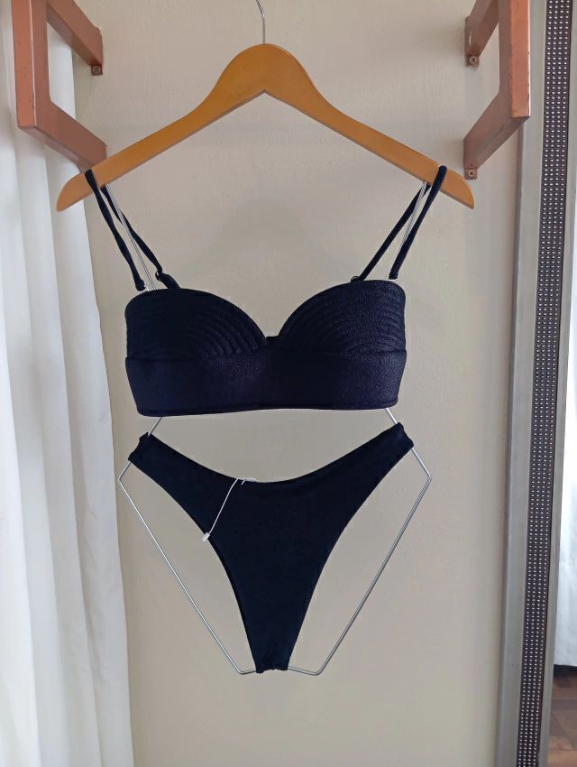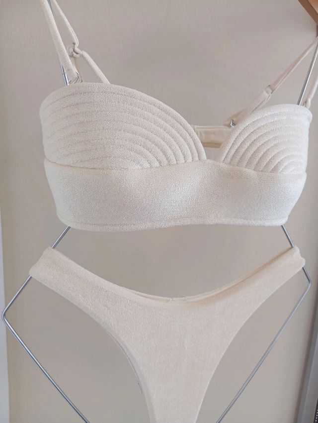 Bíquini confeccionado em material atoalhado, super confortável e inteiro duplo. Possui calçinha tanga e sutiã diferenciado com corte arredondado e costuras em formato concha. Possui alças reguláveis e removíveis. Possui brilho sútil. Combine com nossa camisa bombom.