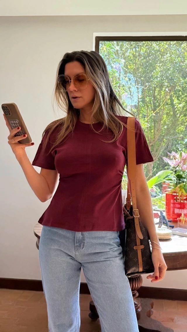 Camiseta em malha de algodão, modelagem ajustada ao corpo com costura no busto que valoriza o colo.
