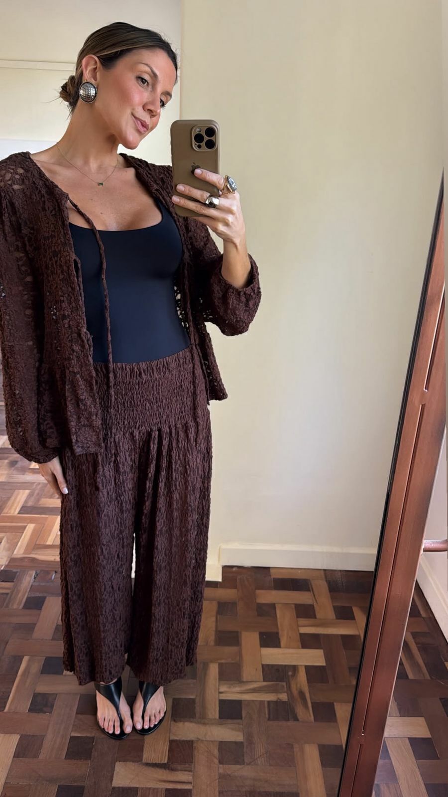Blusa em renda com elastano, possui tiras para amarração. Conta com elástico na barra da manga.