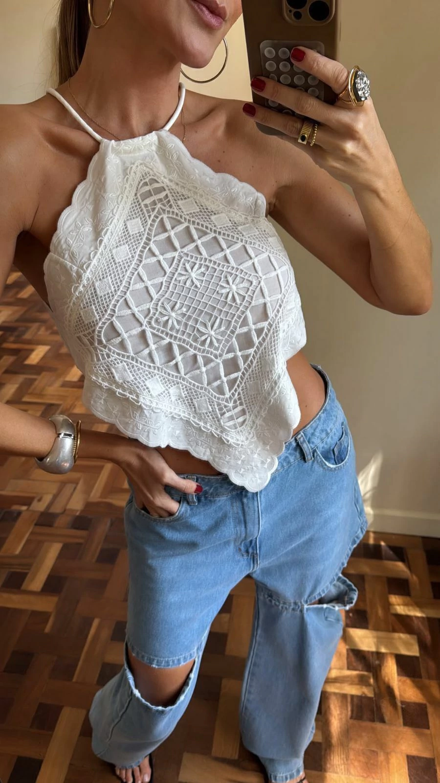 Blusa em laise no formato de losango com bodas arredondadas e amarração na parte do pescoço. Forrada.