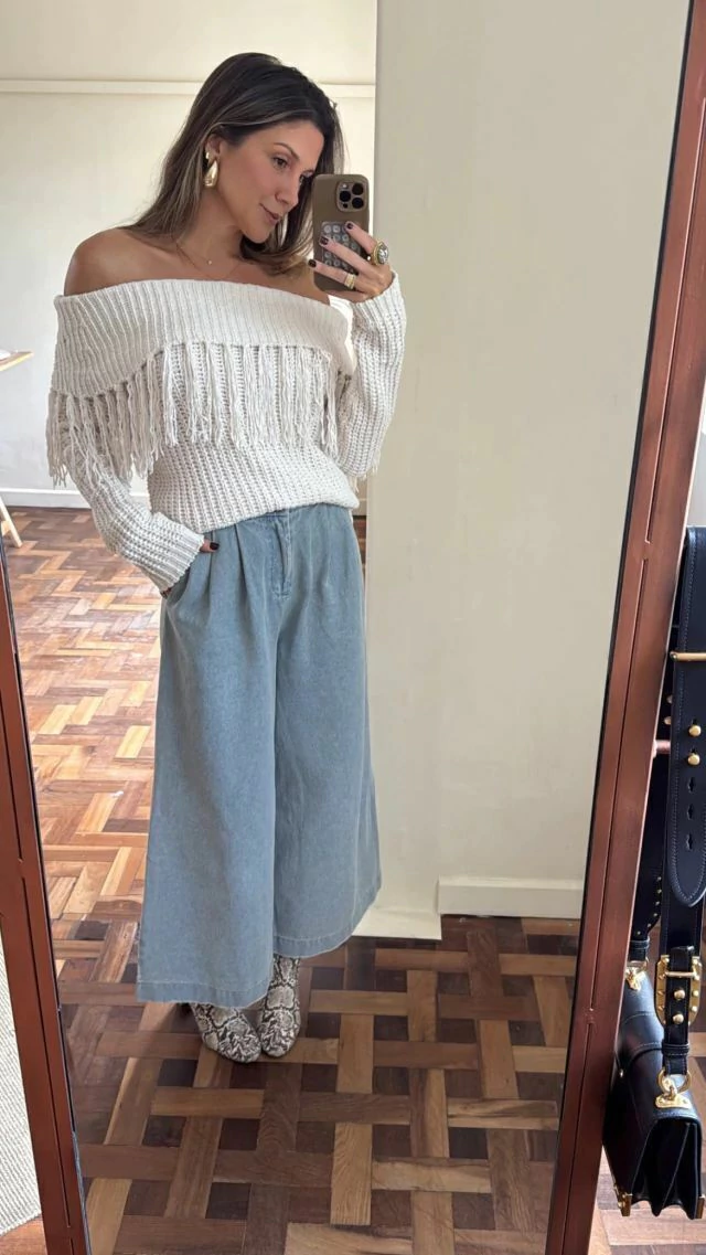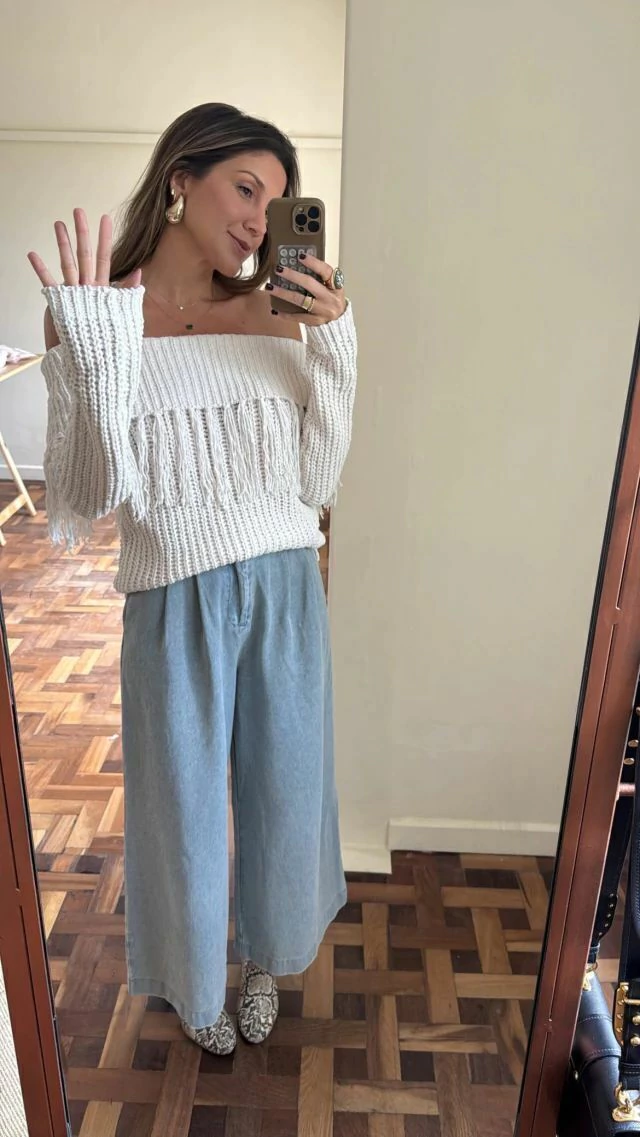 Blusa em tricot suuuuper macio, possui dobra ombro a ombro com franjas aplicadas.