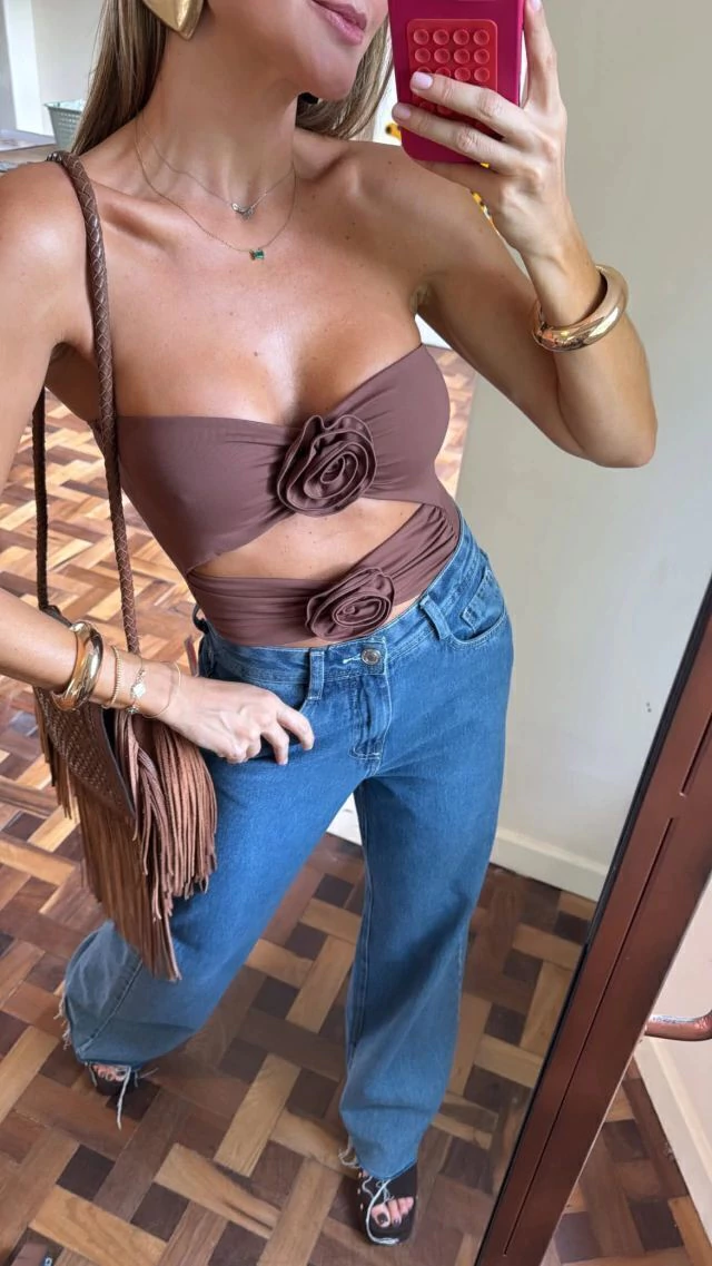 Body diferenciado com aplicação de flores e abertura central, veste como maiô e é confeccionado em uma lycra fruit super confortável e macia.