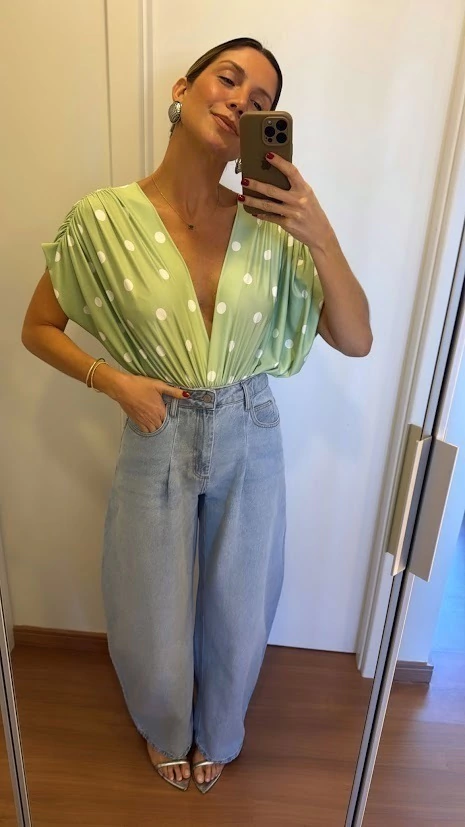 Body em lycra fluit, parte inferior fechada. Franzido no quadril e mangas modelagem morcego com franzido na parte superior do braço. Decote profundo na frente e nas costas.