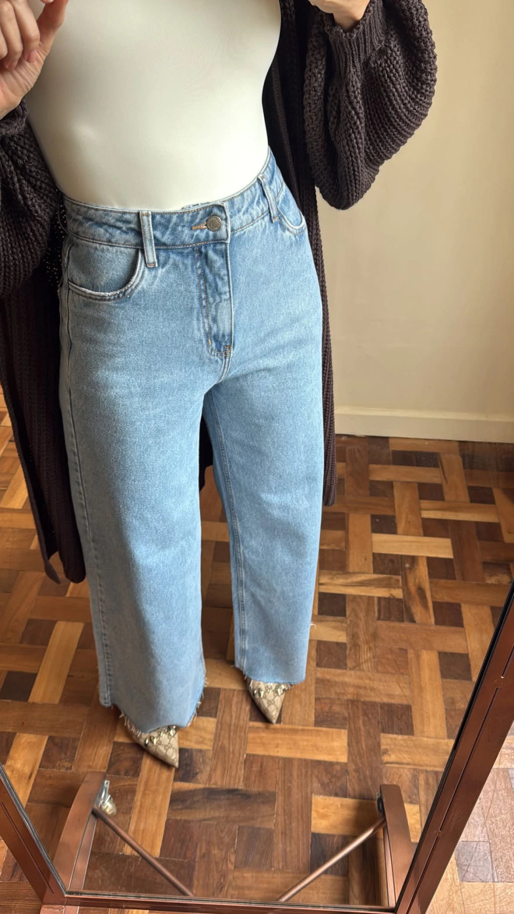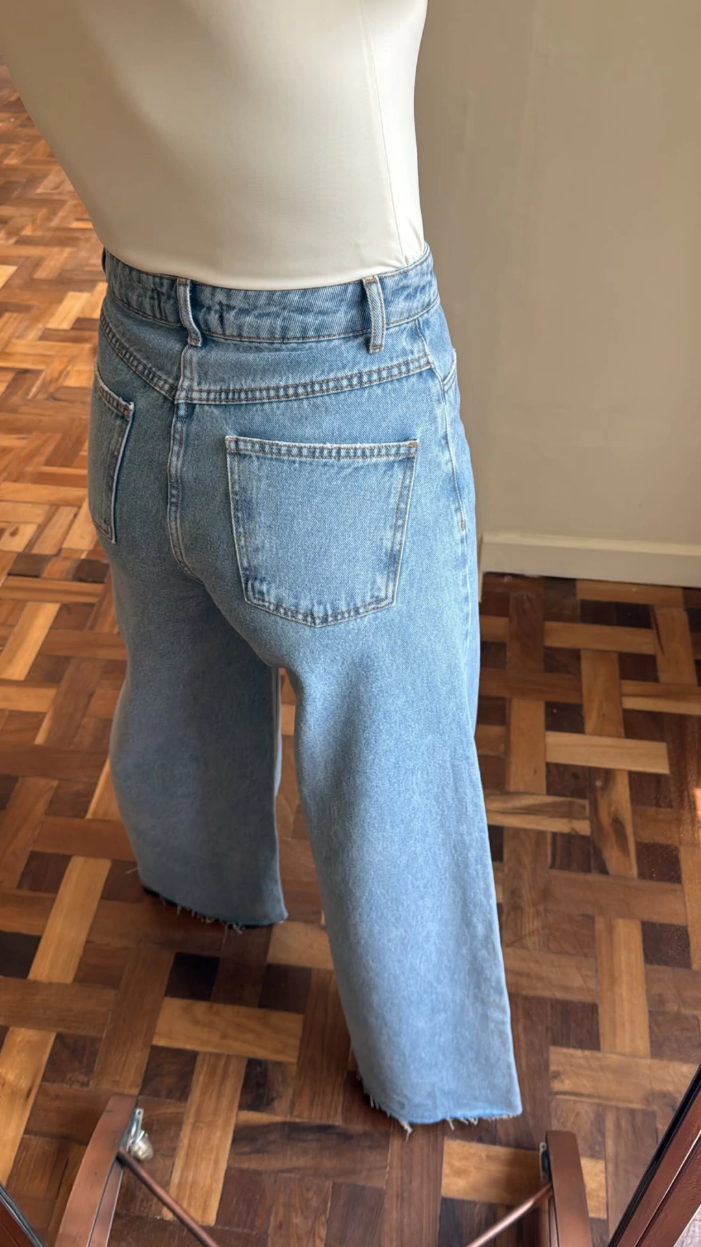 Calça em jeans bem estruturado de lavagem mais clara. Modelagem wide leg, pernas amplas, cintura alta, possui barra a fio que facilita muito o feitio de barra se necessário.