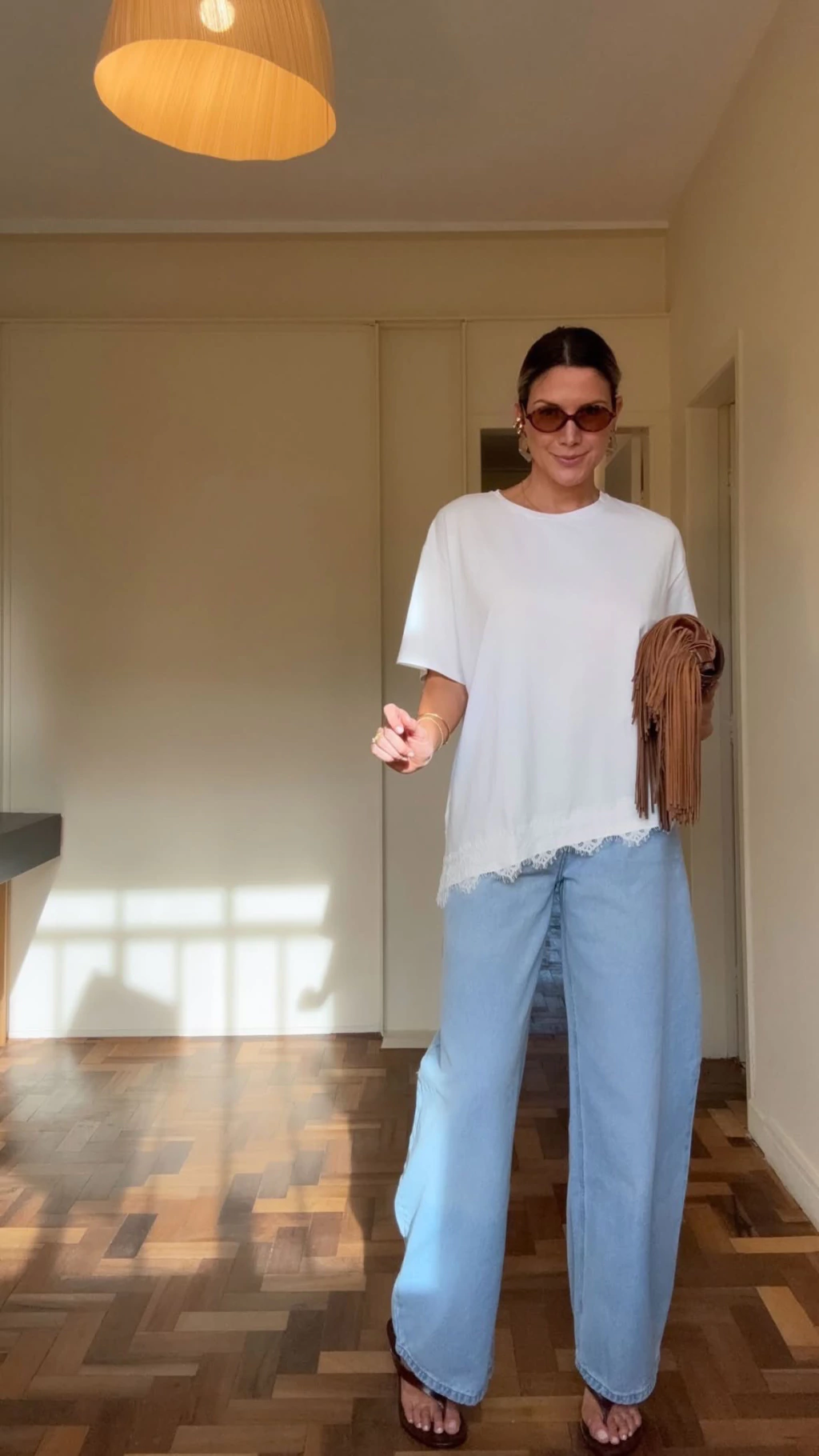 Camiseta em algodão puro, barra assimétrica com aplicação de renda.