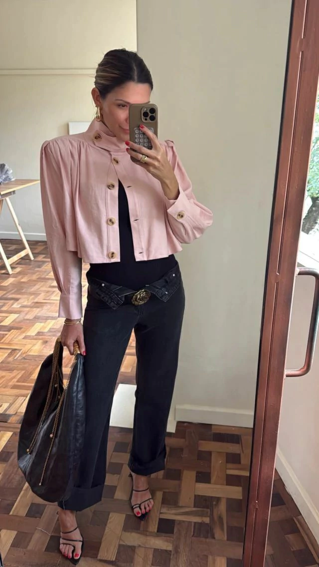 Casaco com corte totalmente diferenciado, autêntico, possui ombreiras, mangas plissadas e com botão na barra, na gola possui tira com fechamento por botões comprimento mais curto e corte mais amplo nas barras.