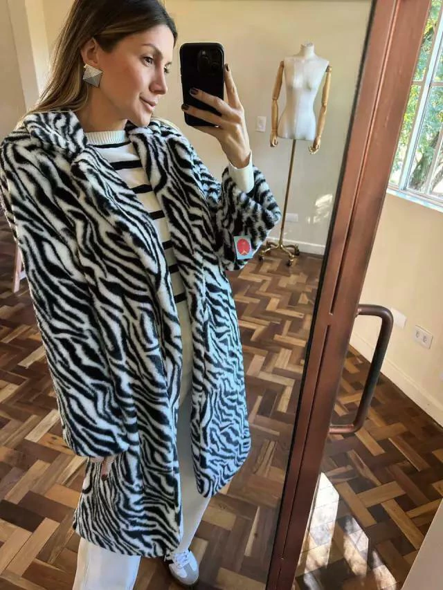 Este casao é uma peça diferenciada e icônica para compor looks invernais com conforto. Confeccionado em fakefur (pele artificial)possui padronagem de estampa zebra, que esta super em alta em todas as passarelas. É todo forrado e muito quentinho, vendido em tamanho único que veste bem desde o PP até o G, possui modelagem ampla e comprimento longo.