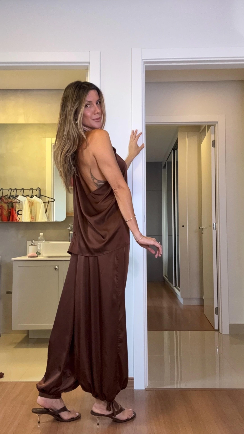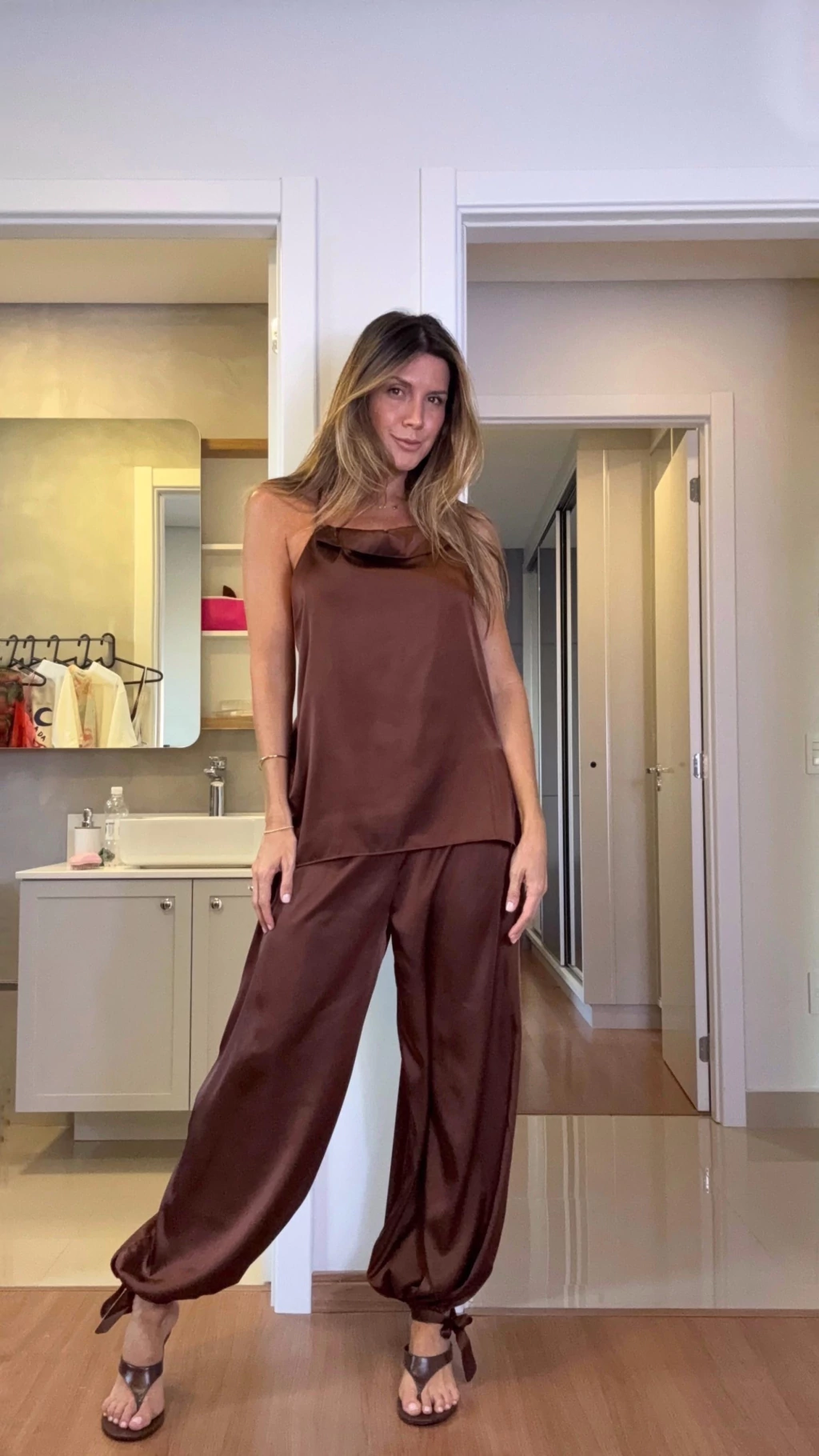 Conjunto em cetim levinho, calça com botão, zíper e bolsos. Modelagem aladin possui tiras para amarração nas barras.
