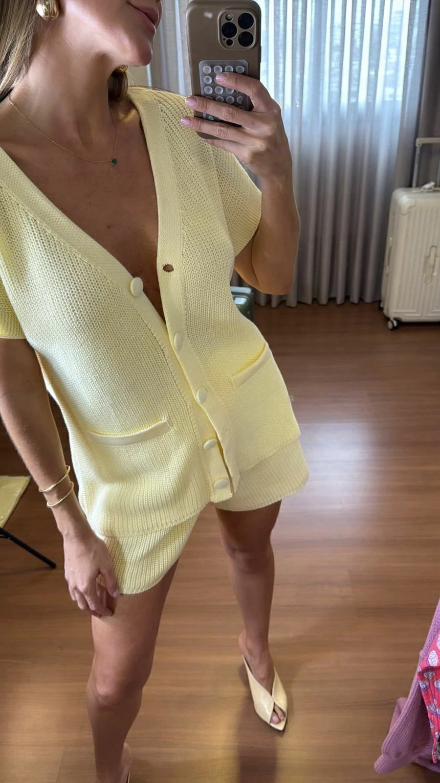 Desfrute do toque super macio deste conjunto em tricô, perfeito para quem busca conforto sem abrir mão da elegância. A blusa conta com fechamento por botões encapados e manga curta, enquanto o short possui modelagem soltinha com elástico na cintura para ajuste ideal.