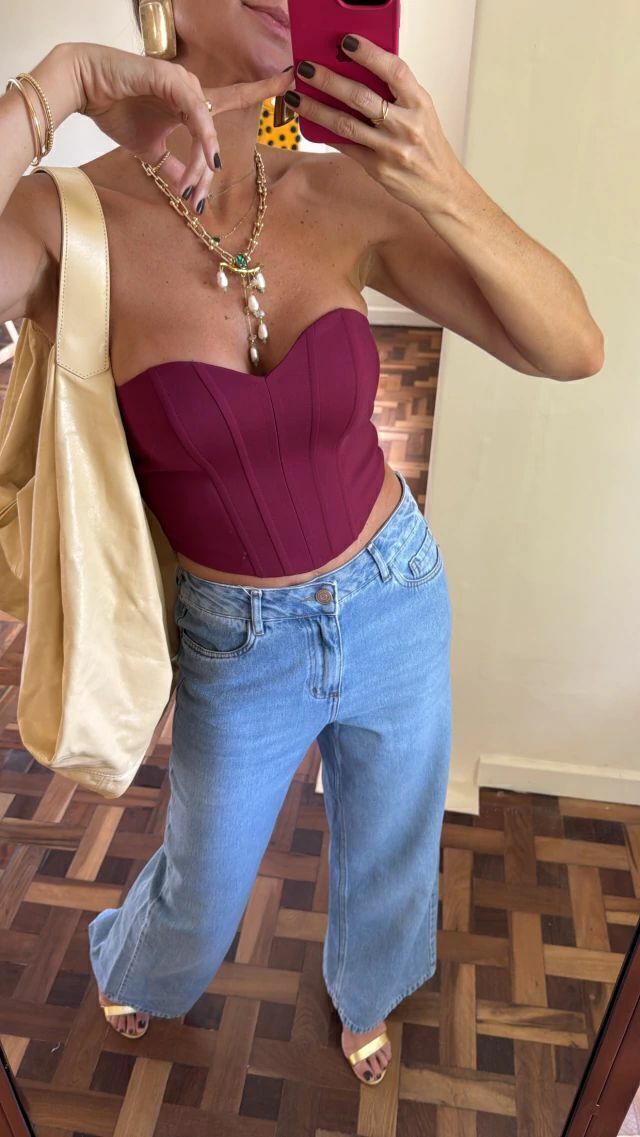 Corset estruturado em alfaiataria dupla com elastano, possui barbatanas embutidas garantindo sustentação. Fechamento com zíper nas costas.