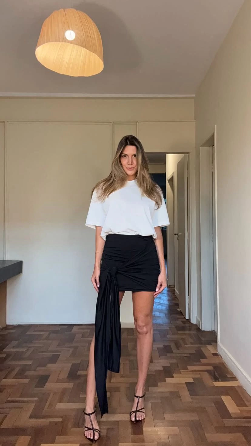 Mini saia em poliamida firme toda dupla, possui nó na frente com faixa caída.