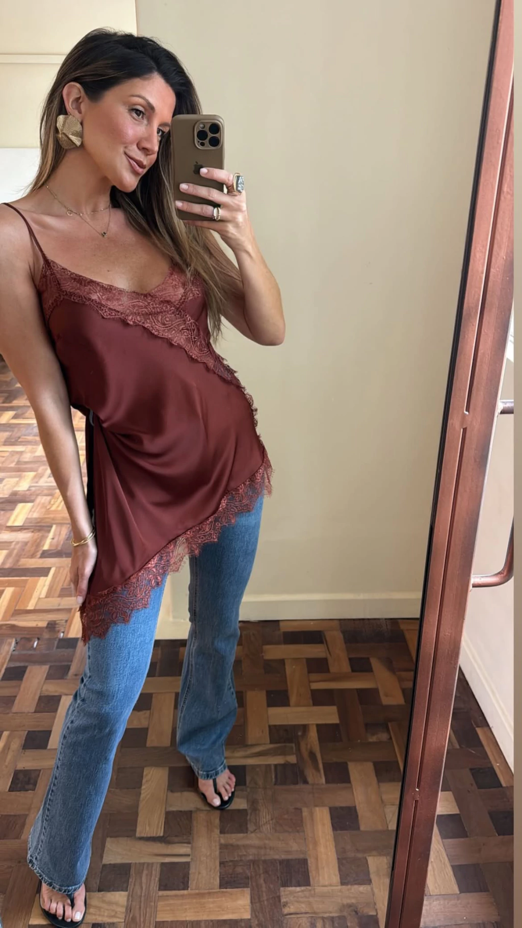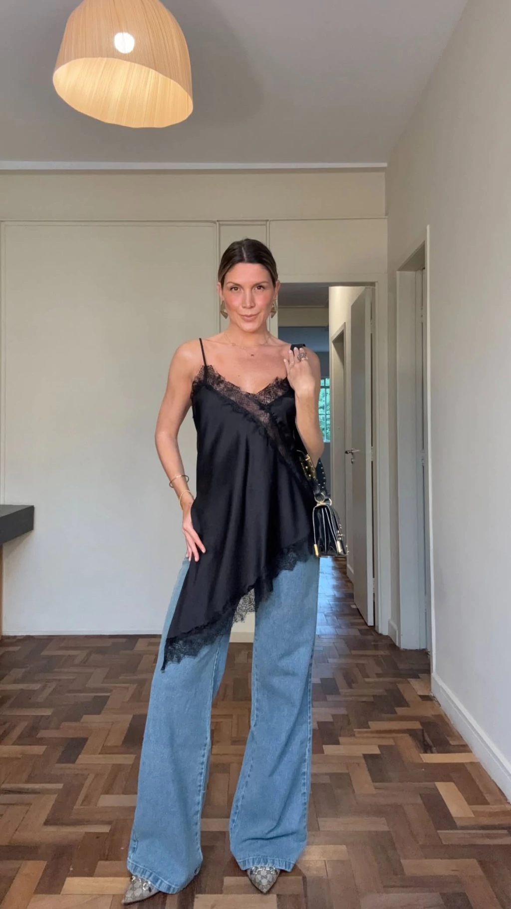 Regata em cetim corte assimétrico, com alcinhas reguláveis, aplicação de renda super delicada no busto e nas barras.