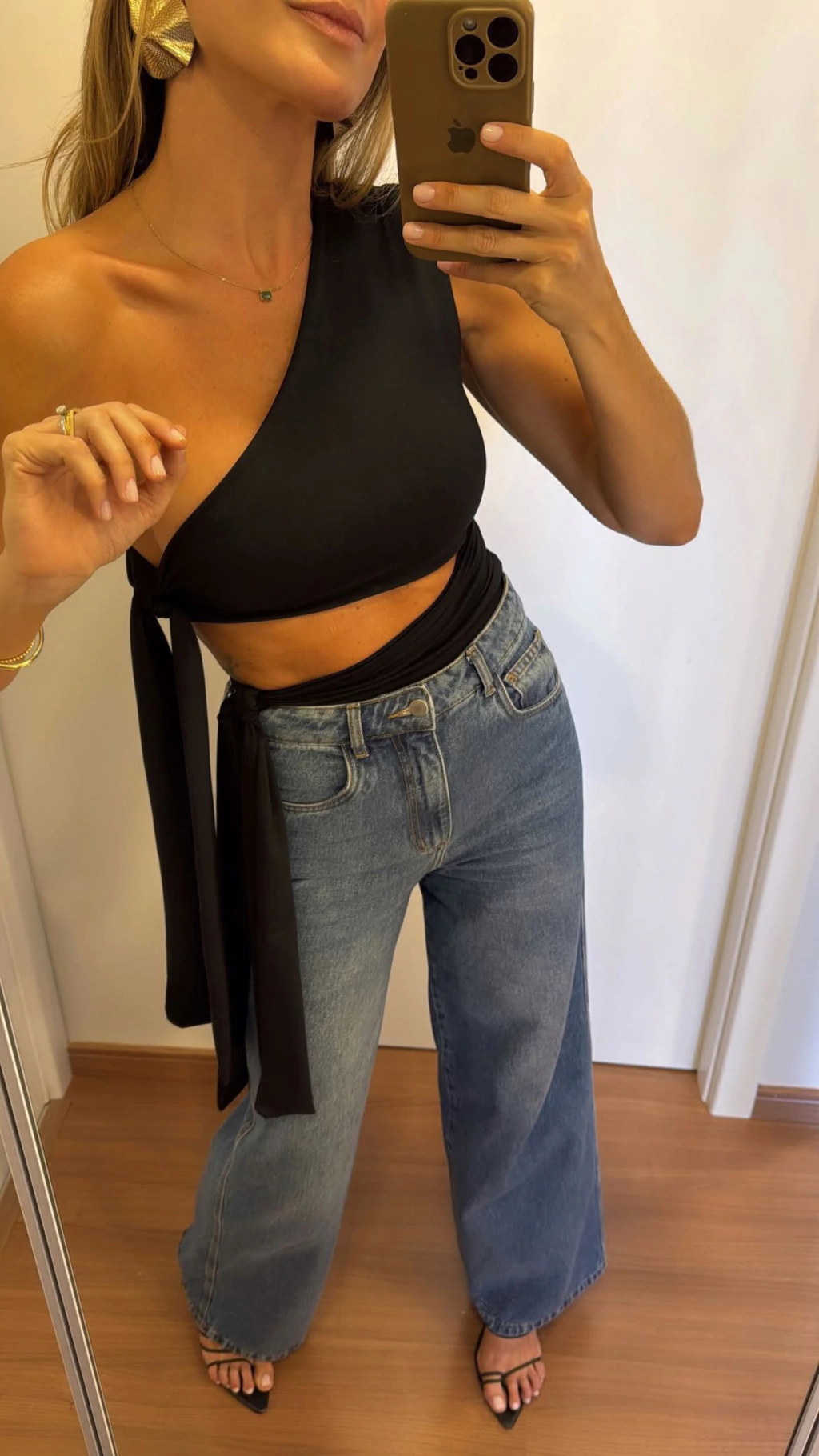Regata em lycra fluit firme, toda dupla, possui dois recortes com amarração e alça única.