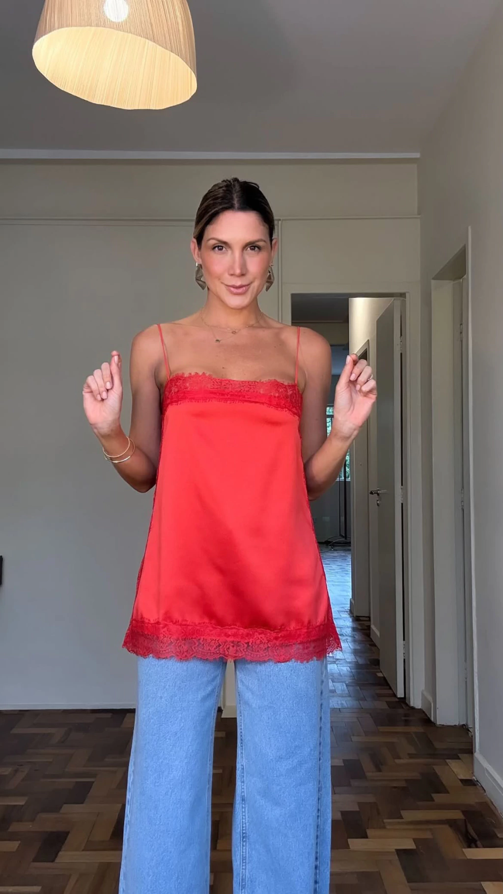 Regata em um crepe acetinado com renda aplicada no busto, barra e laterais. Alcinhas elásticas.