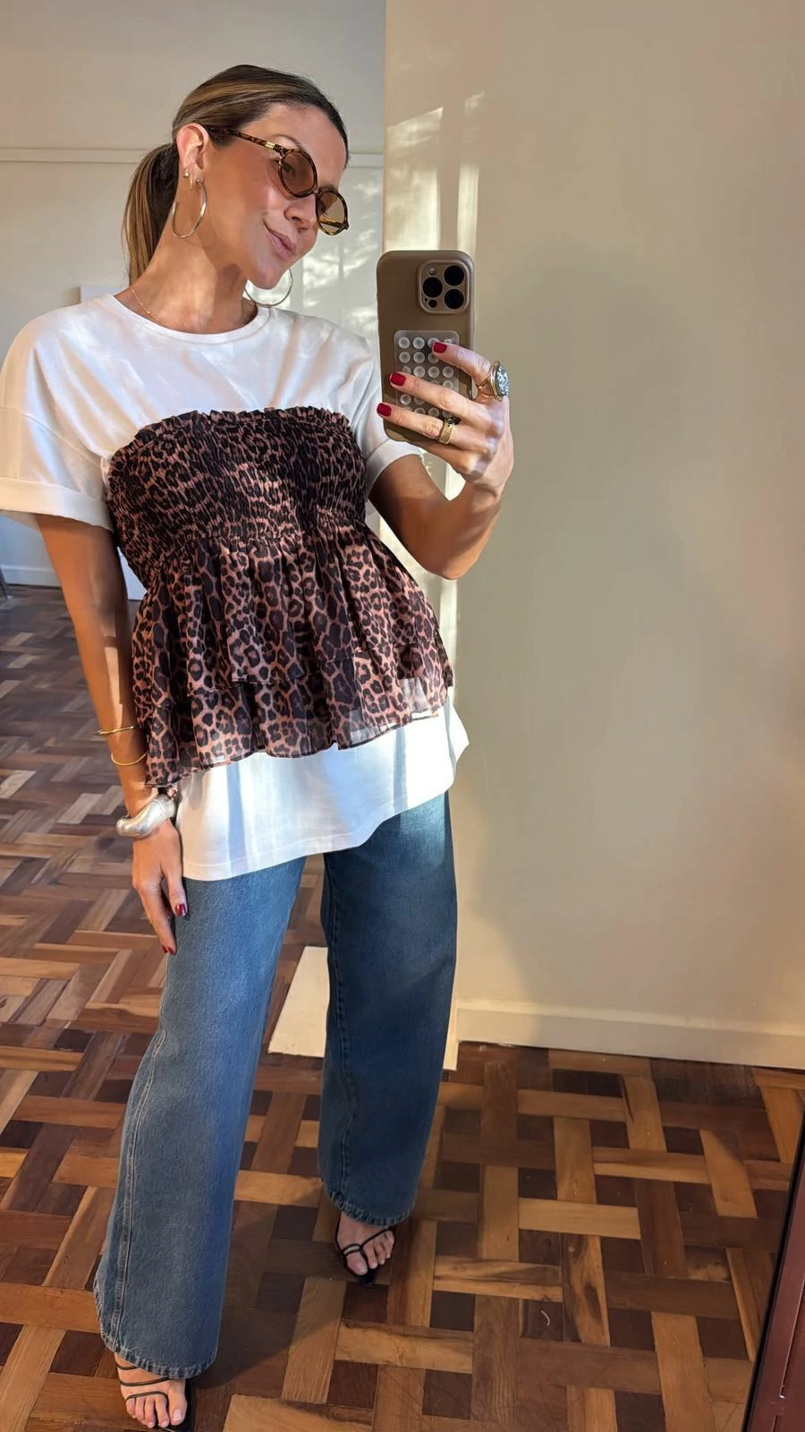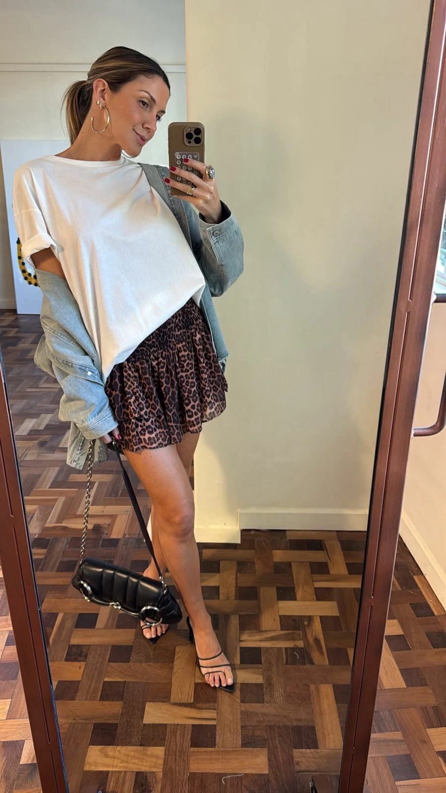 Saia curta em estamda de onçinha, cintura alta com elástico franzido permitindo ótimo ajuste ao corpo, duas camadas sobrepostas com bainha levemente ondulada e forro na cor marrom.