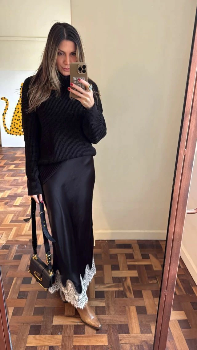 Saia em cetim, fechamenton por botão, aplicação de renda na barra.