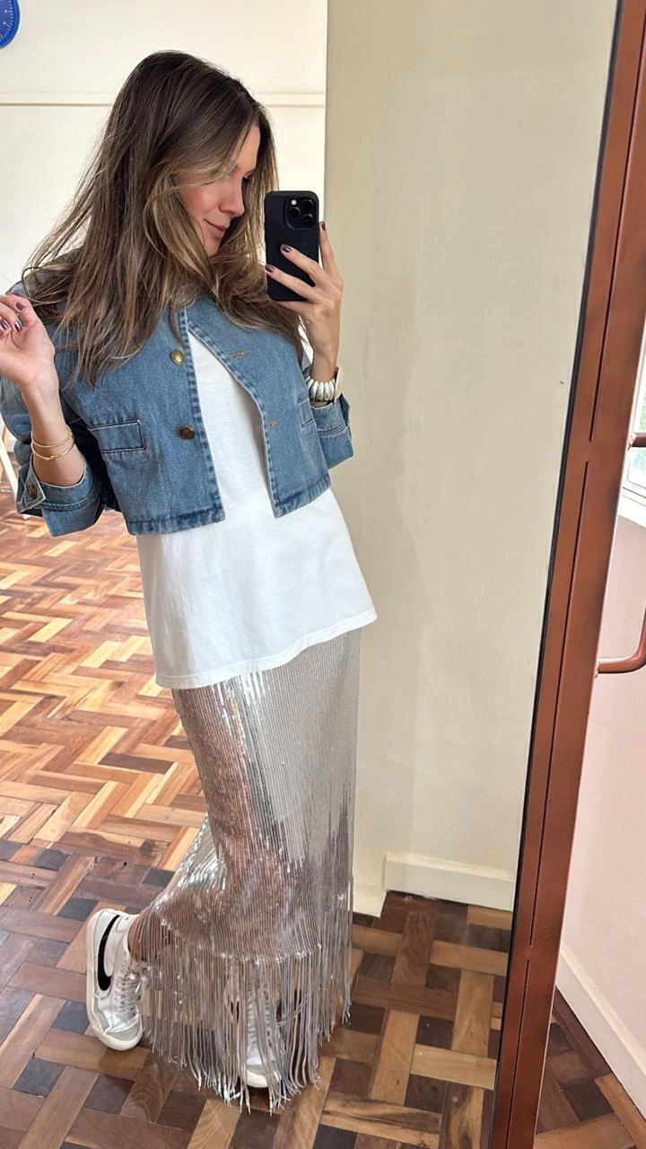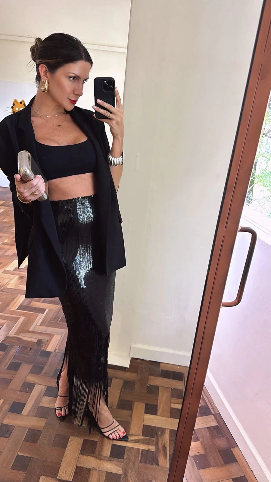 Saia paetê com franjas na barra. Possui um pouco de elastano. Recomendamos o tamanho P para manequim 34 a 38 e tamanho M para manequim 38 até 42.