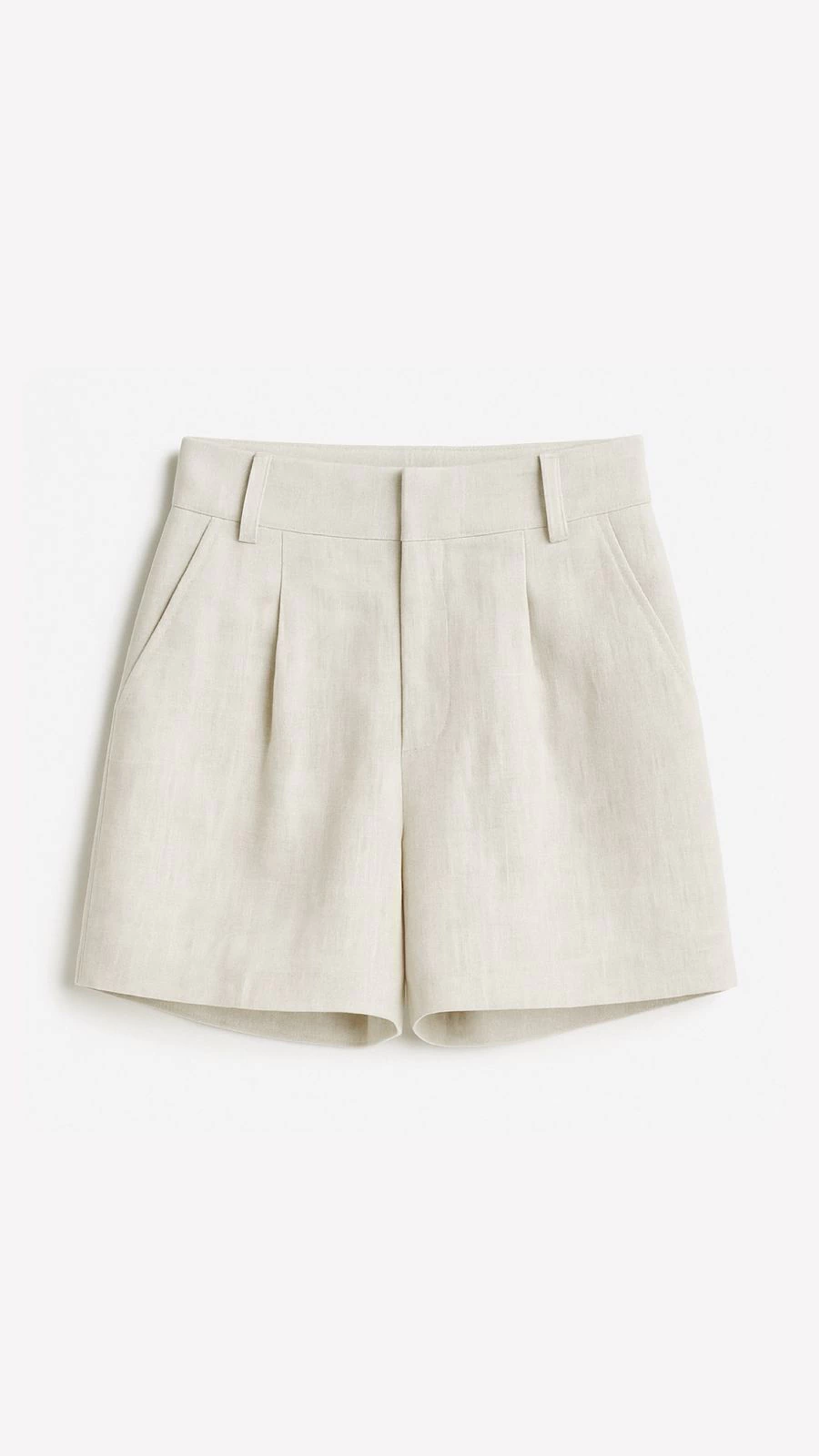 Short em alfaiataria, confeccionado em linho puro, fechamento por feixo metálico embutido e zíper. Bolsos funcionais e passante para cinto. Forrado.