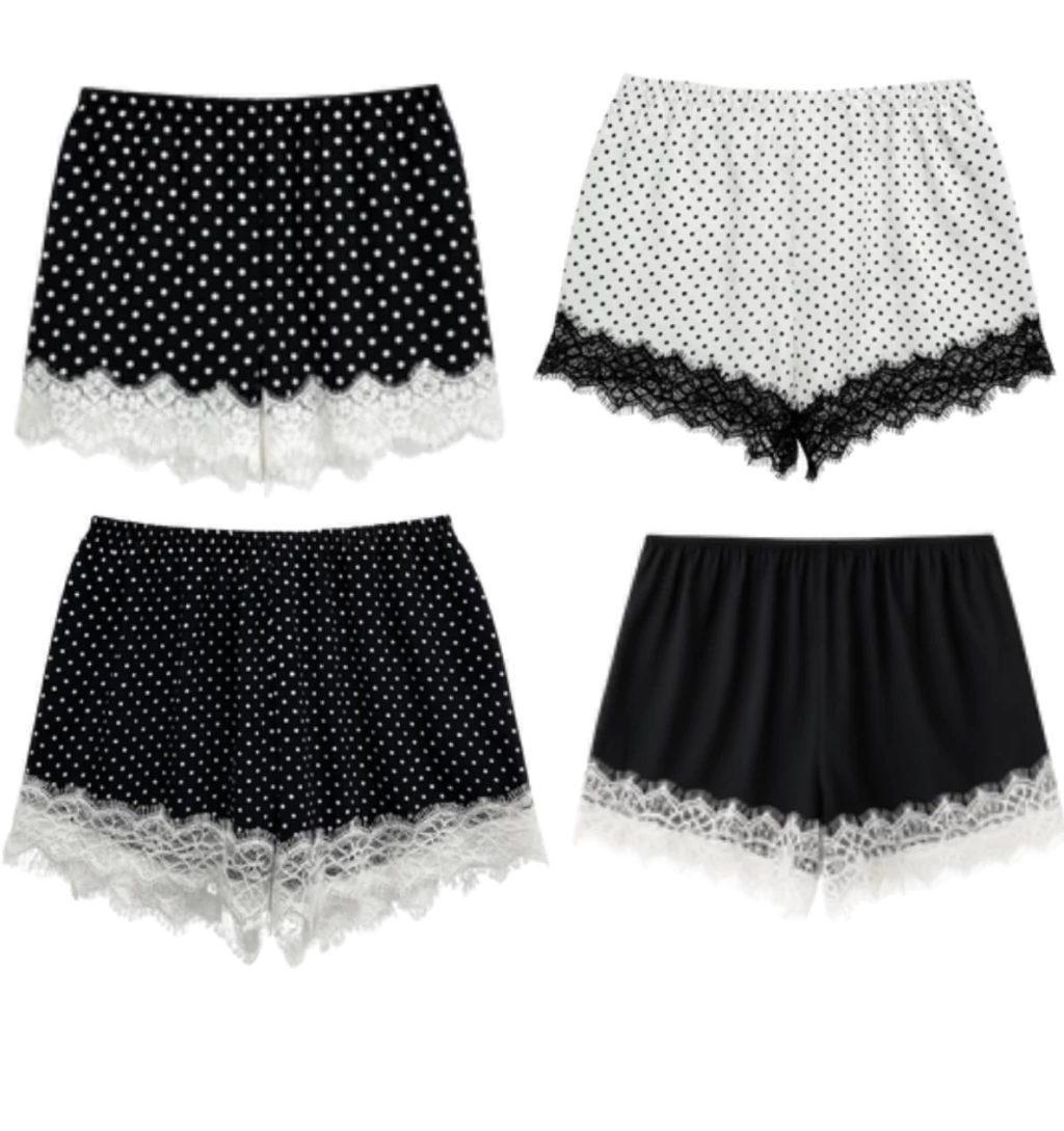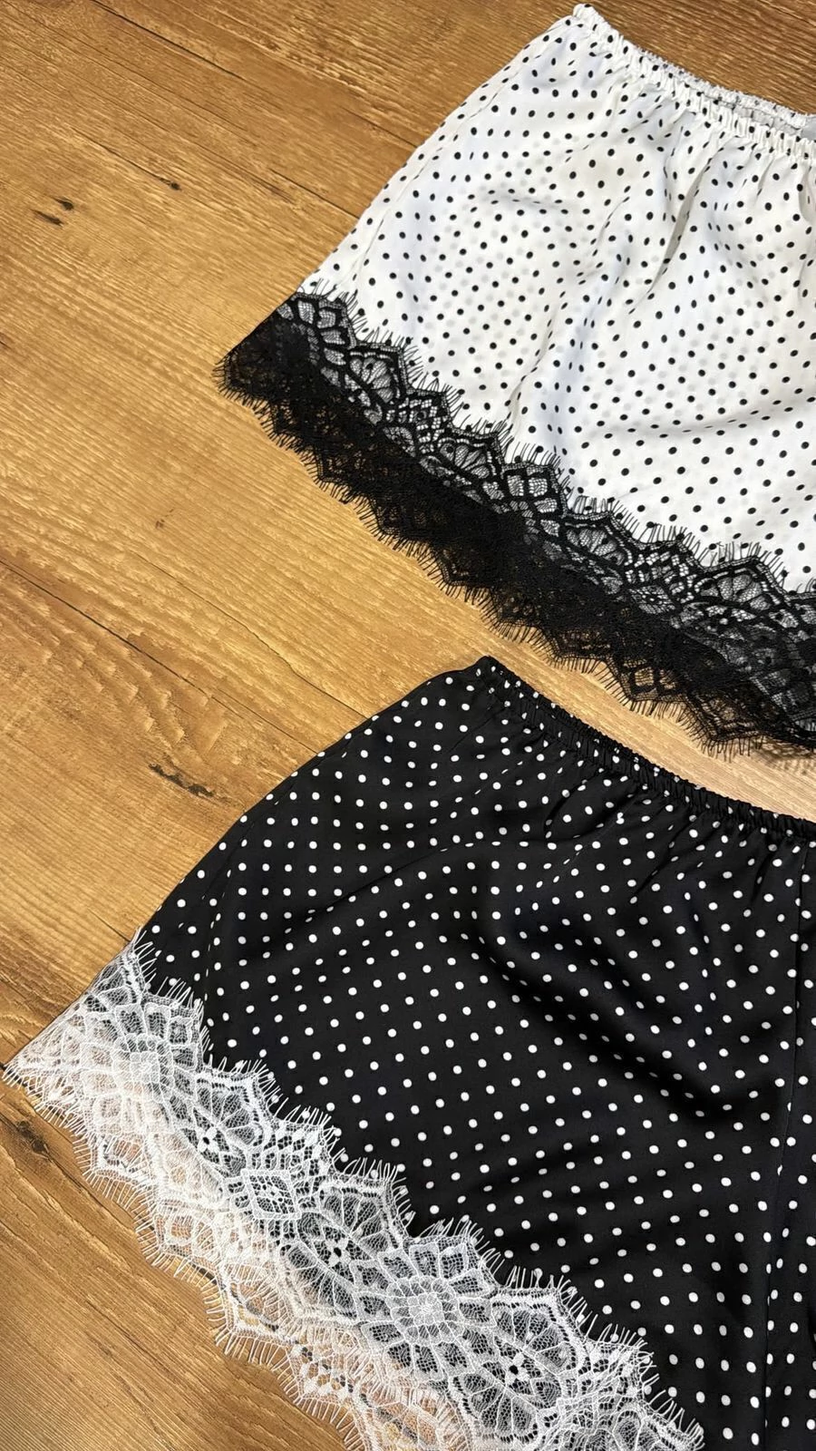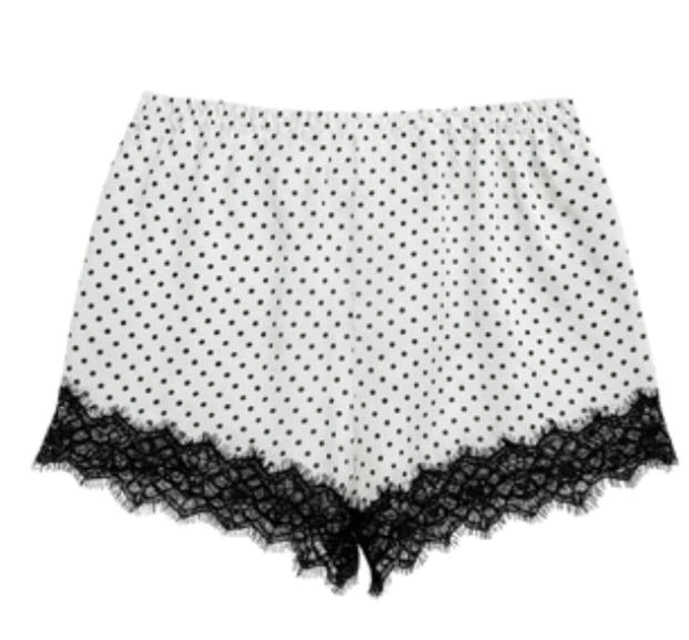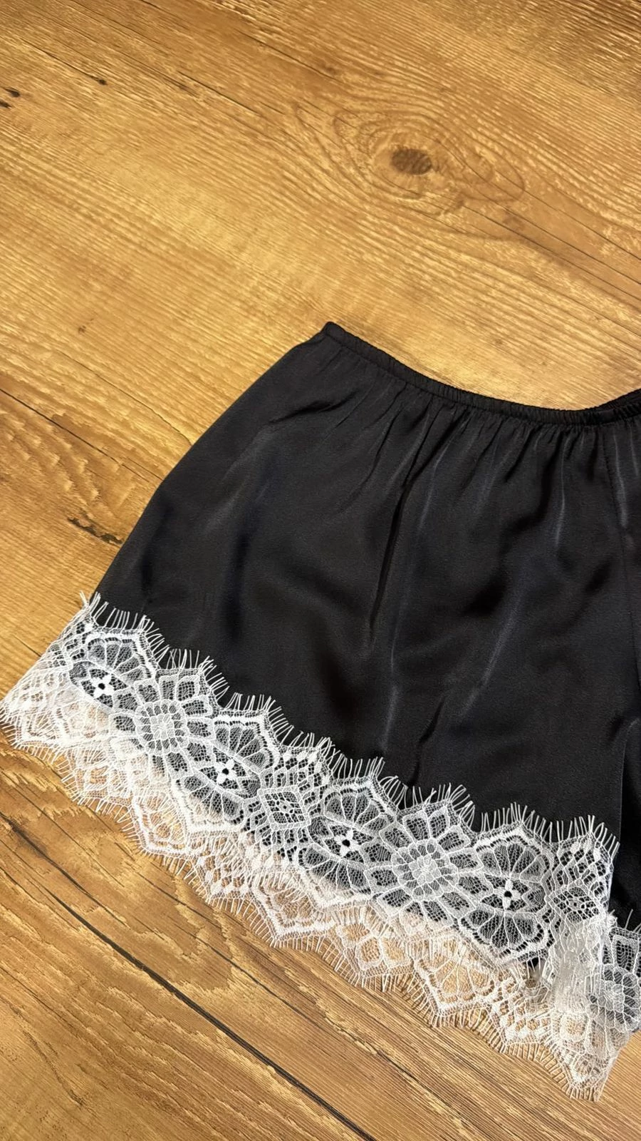 Short curto em cetim, com aplicação de renda na barra. Possui elástico na cintura.