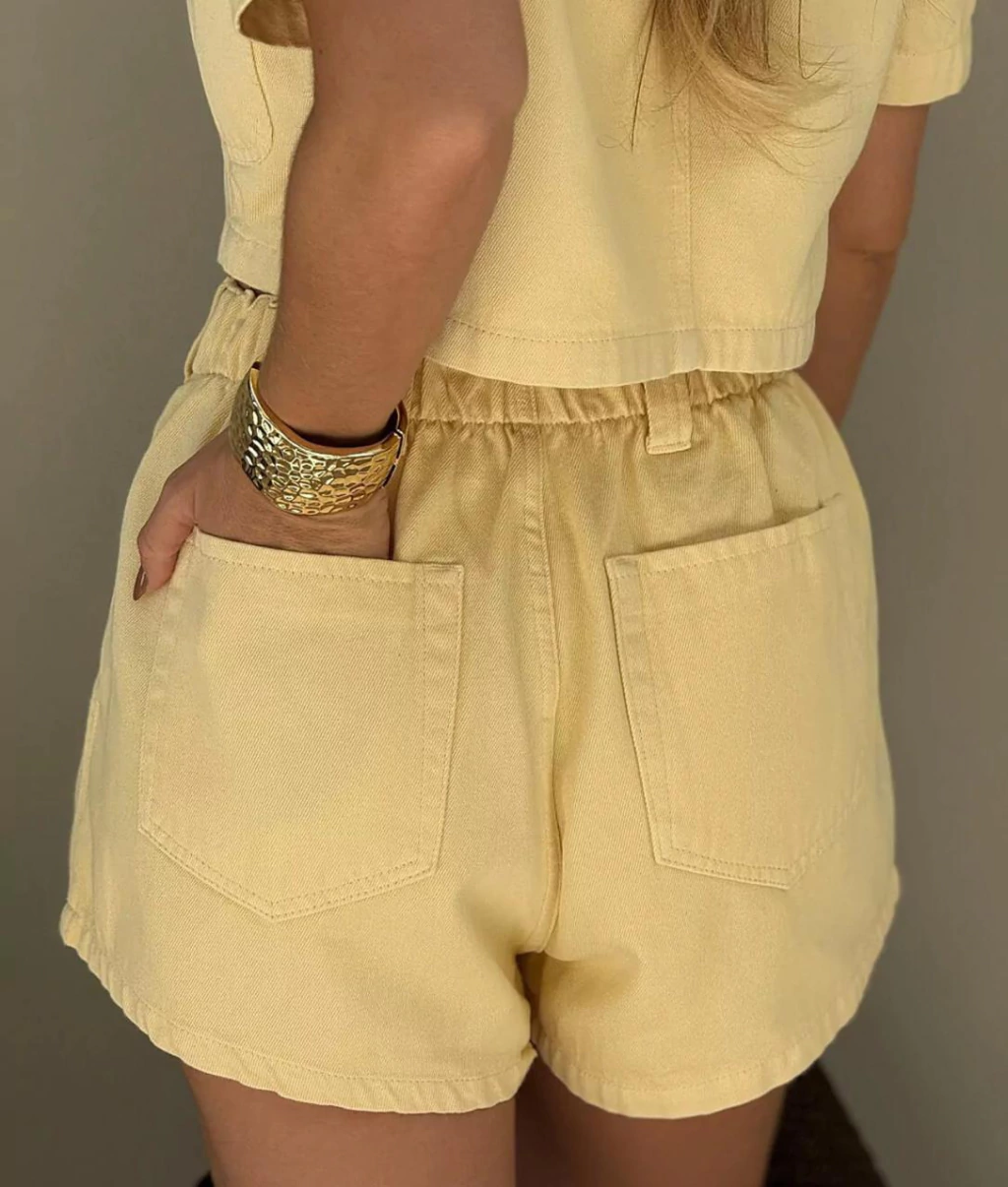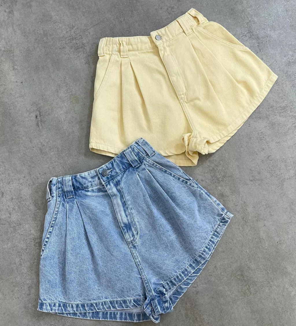 Short em jeans macio, com elástico nos cós na parte de trás, caimento mais soltinho e com pregas.