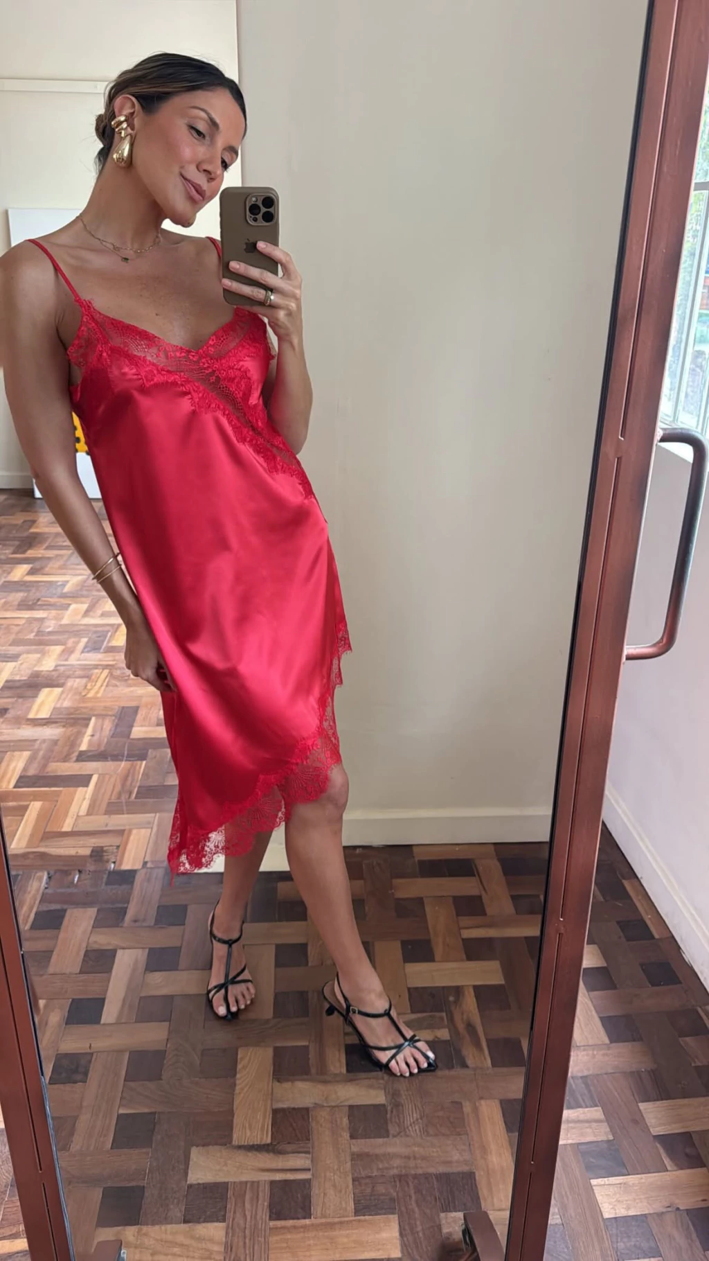 Vestido curto em cetim com corte assimétrico, aplicação de renda na barra e busto. Alcinhas reguláveis.