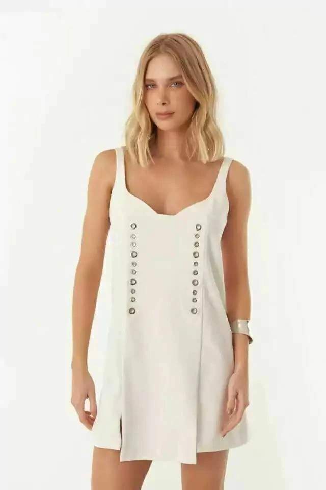 Vestido curto em alfaiataria, possui duas pequenas fendas frontais e detalhe em ilhõs prateados. Alças largas, decote reto e comprimento curto. O modelo é todo forrado e possui zíper invisivel lateral.