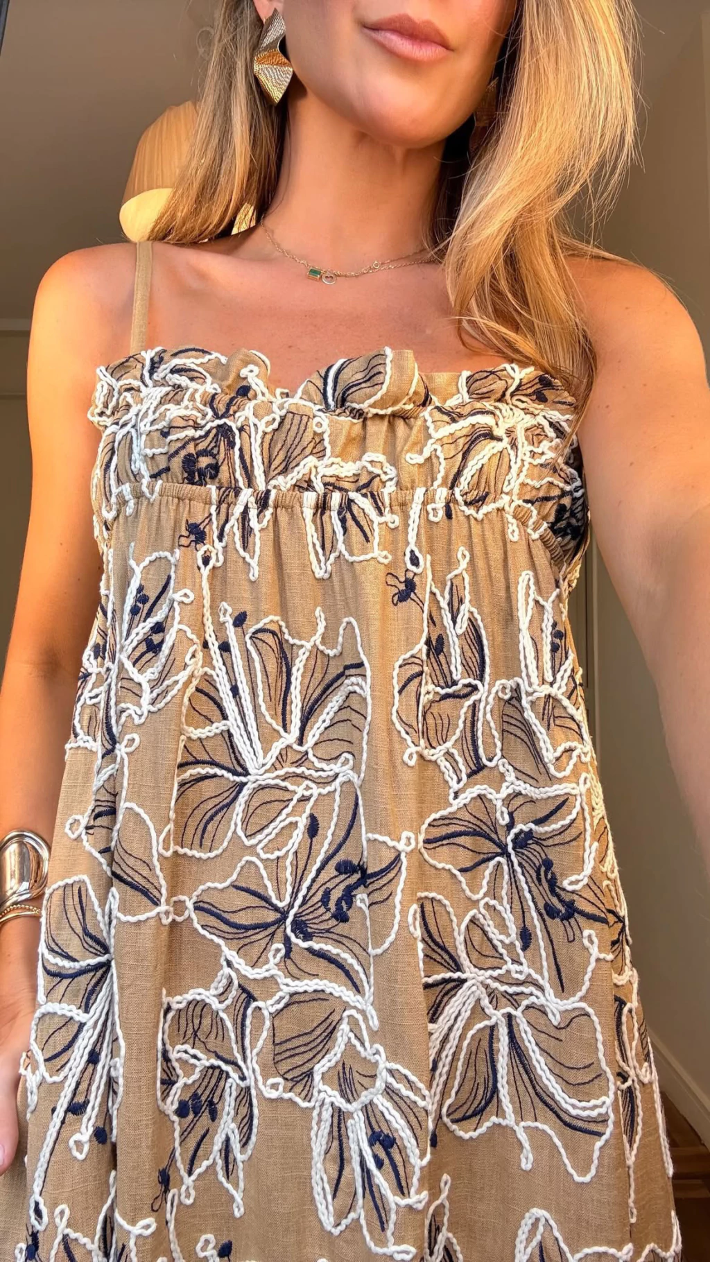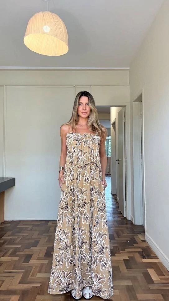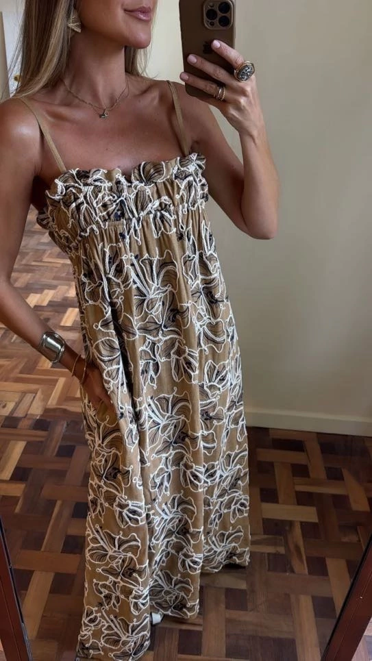 Vestido em tecido misto de algodão, viscose e linho, encorpado, com trabalho em cordão bordado. No busto possui elástico que traz o frufru que amamos e alcinhas com regulagem.