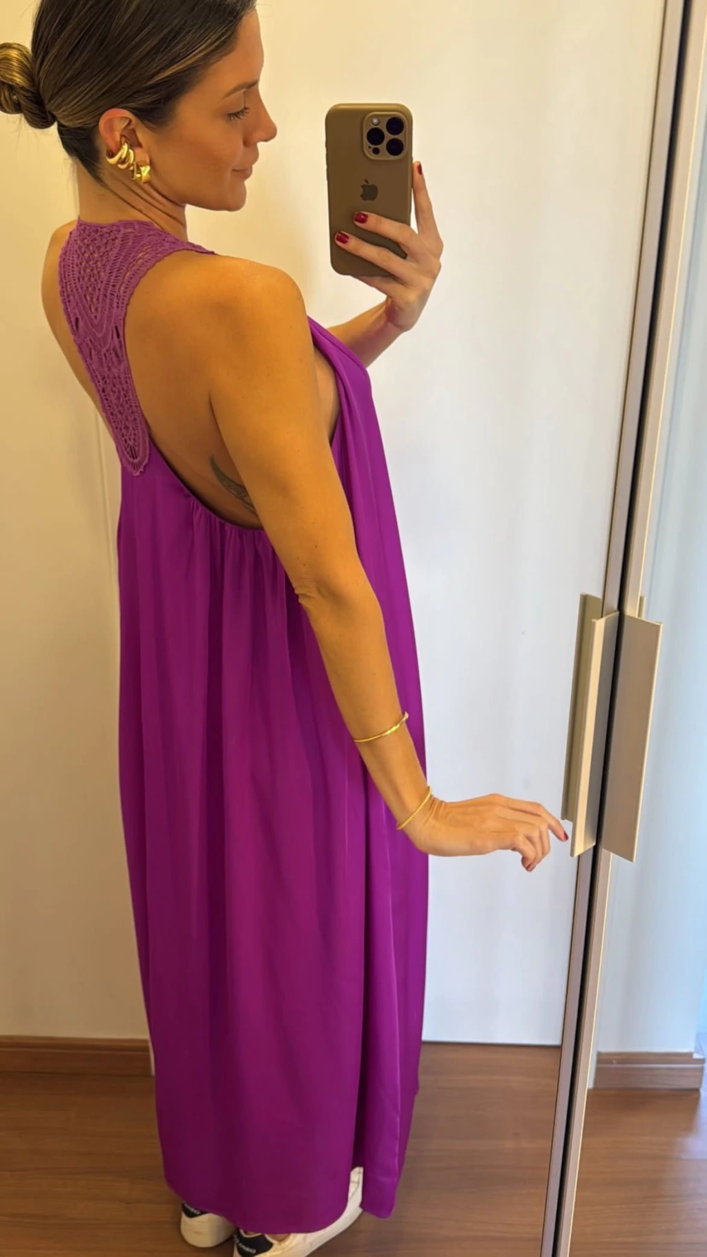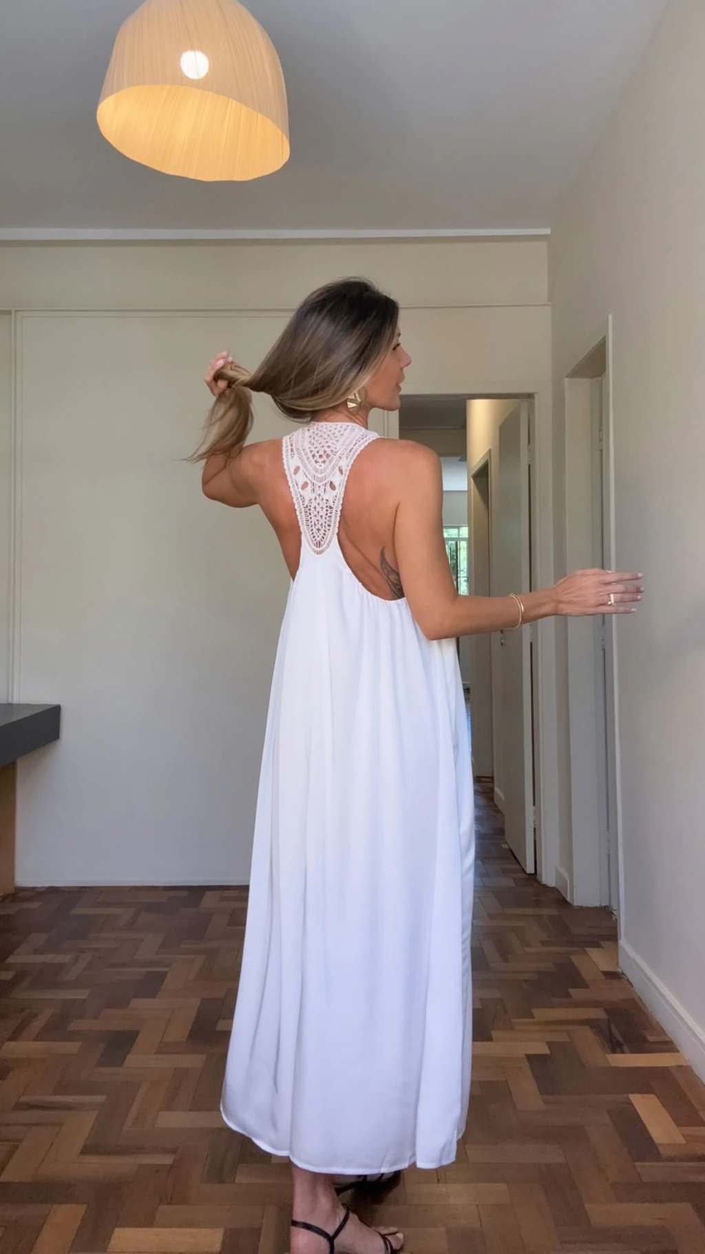 Vestido em cetim super gostoso com toque muito semelhante a seda, possui renda em macramê nas alças, caimento leve e com movimento, todo forrado.