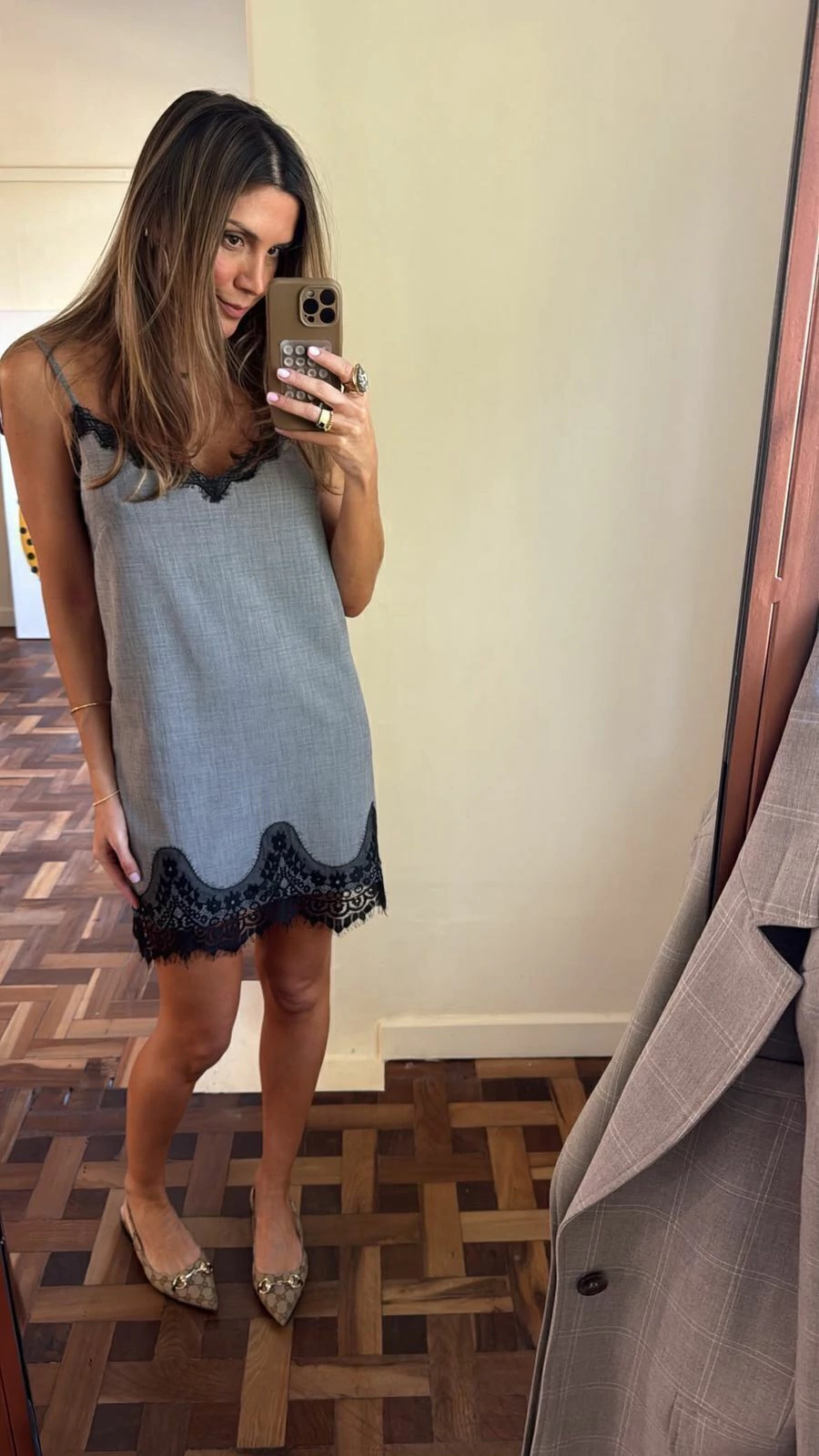 Vestido em crepe, com alça regulável e acabamento em renda.